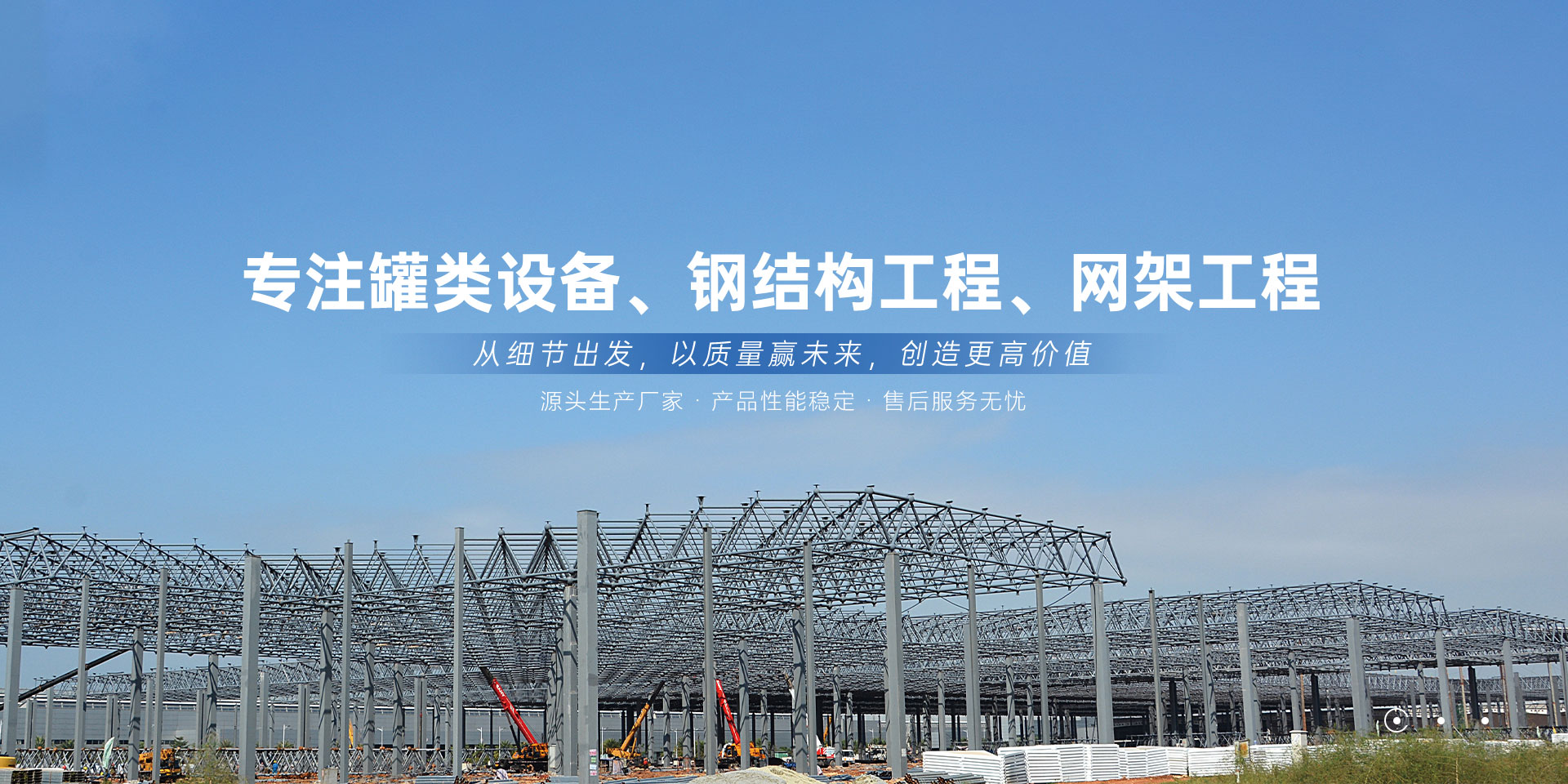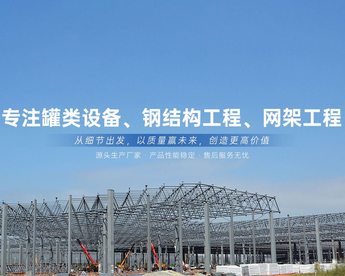 各式罐類設備、鋼結(jié)構(gòu)工程、網(wǎng)架工程的設計、制作、安裝為一體